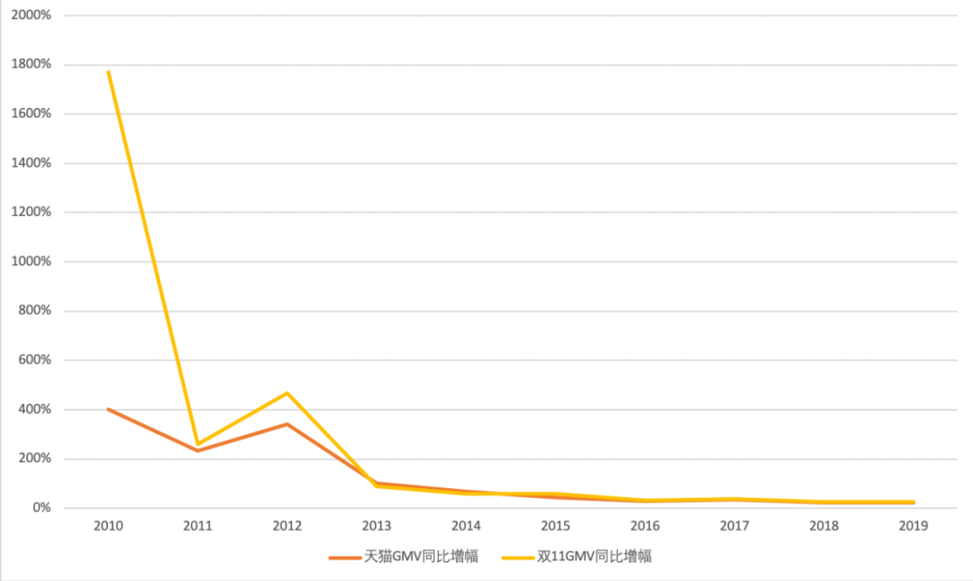 通过对比历年双十一交易额的增速和相应年份天猫年交易额的增速,不难发现双十一对天猫的带动作用愈发减弱,从双十一快速带动天猫大盘增长到对天猫销售额的助推日渐乏力,分水岭出现在了2013年。