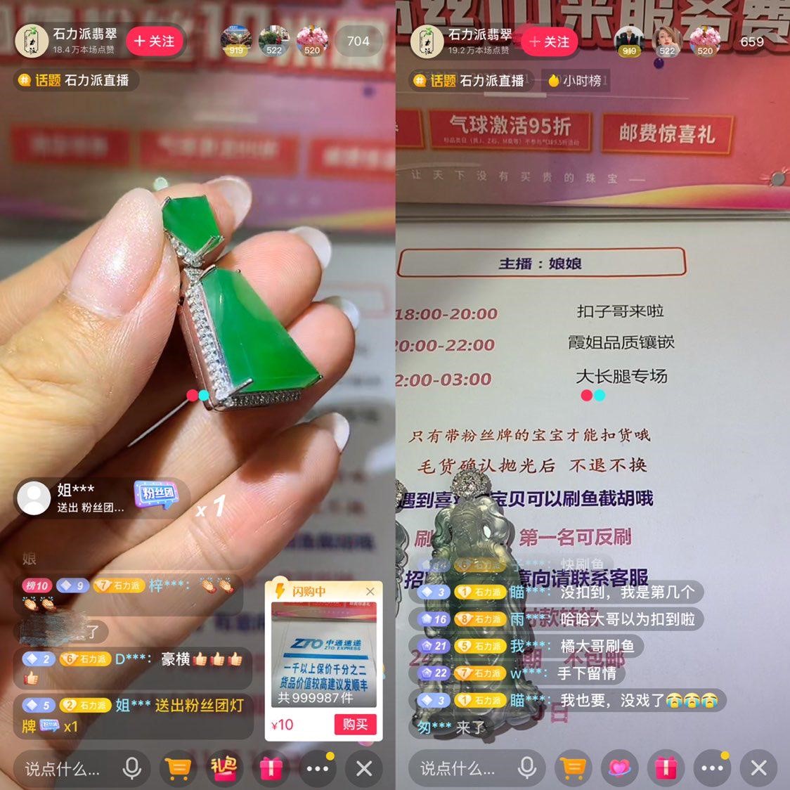 除了超长时间,珠宝主播还有不少“套路”。比如实力派翡翠,主播“娘娘”先一一介绍珠宝的成色、市场价值,用户先要加入粉丝团,再听从“娘娘”口号,扣出一个数字,最早出现在公屏上的粉丝才有资格购买。如果粉丝有一眼看中的珠宝,还可以送出价值399元抖币的锦鲤“截胡”直接获得购买资格。
