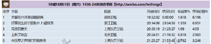 来看看今年其中几场晚会的成绩。根据CSM59城收视率显示,湖南卫视、浙江卫凭借天猫双十一开幕直播盛典和好事发生苏宁易购超级秀以1.618和1.559的收视率拿下晚间段自办节目的前两名。根据芒果TV显示,截止到11月10日,天猫双十一开幕直播盛典的播放量为7499.6万。