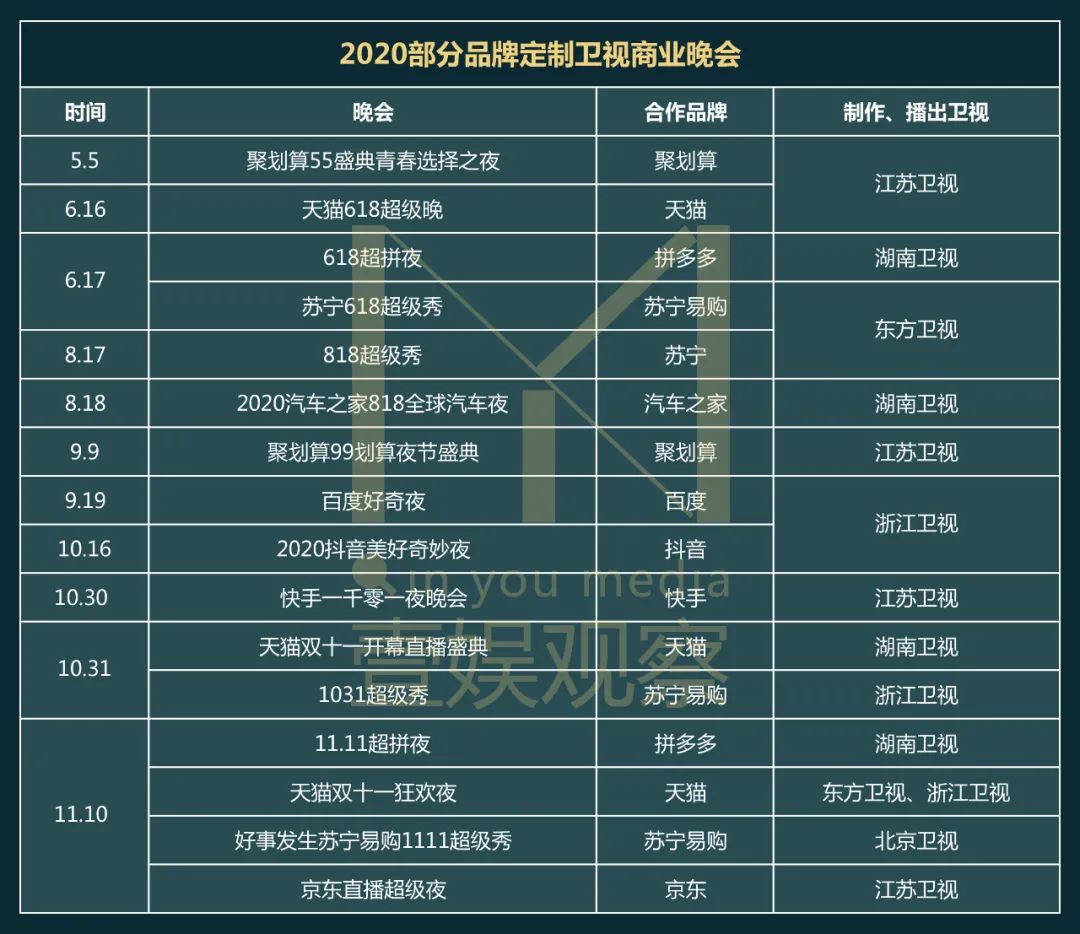 可以预见,未来电商、品牌定制晚会将会是卫视的趋势,也是其继续布局和发力的重点之一,但这晚会依旧是头部卫视们的较量,网传明年湖南卫视月月都会有晚会,而浙江卫视也保底冲向10场,而这些晚会背后,绝大多数都会以品牌定制为主。