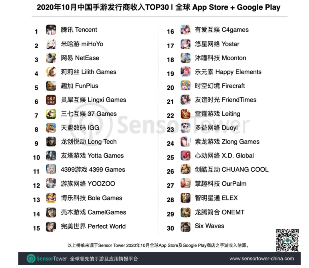 近日,Sensor Tower商店情报平台显示,游戏《原神》的开发商米哈游10月收入环比激增567%,跃居全球发行商收入榜第二名,仅次于腾讯,超越Playrix,Zynga等众多资深海外大厂,成为最年轻的头部游戏厂商。而《原神》公测是从今年9月28日才开始的。