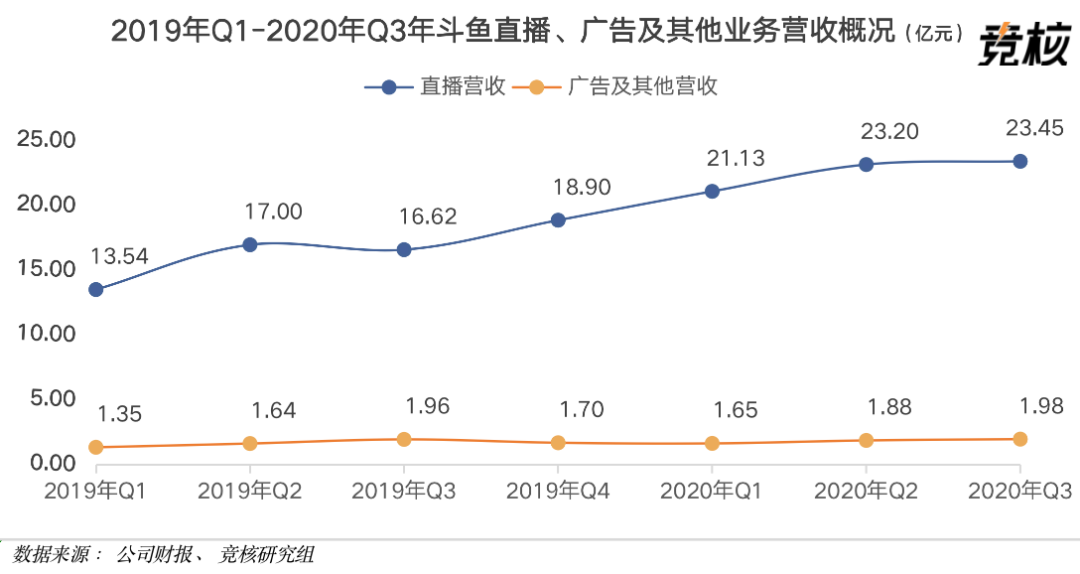 斗鱼Q3财报显示,直播业务营收23.448亿元,占总营收比重超过9成,同比增长41.3%;广告和其他业务营收增长至1.978亿元。