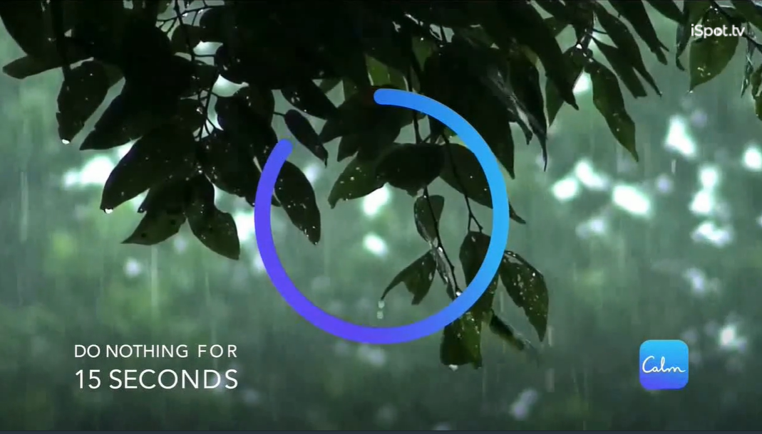 这些广告的样式一模一样,是一个雨打树叶的白噪音,试图让你放下一切,静下来 15 或者 30 秒钟。最后有一个慵懒的女声提示你“现在就免费下载 Calm”。