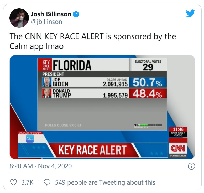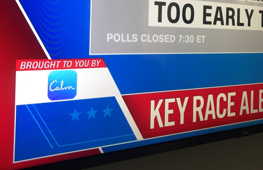 Calm 的发言人对 TechCrunch 说:“这个选举周期的不确定性可能会让我们许多人感到焦虑,尤其是这还是疫情期间。我们在 CNN 的选情快报投广告,是为了给观众提供片刻的宁静,并提醒他们在紧张的夜晚深呼吸。”