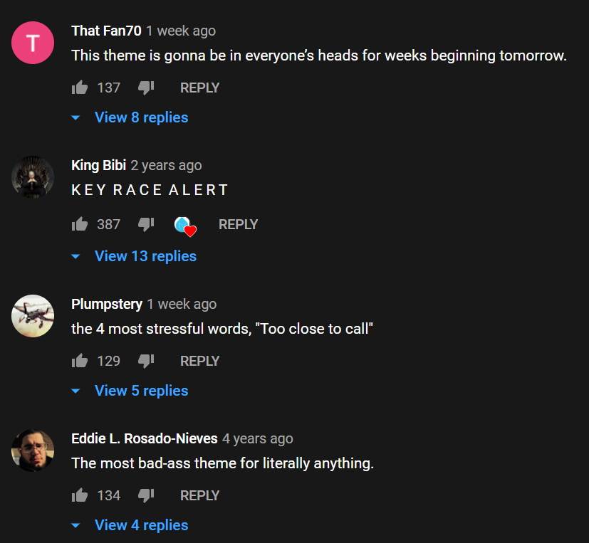 Calm 的广告赞助通常是一个 15 秒或 30 秒的广告片,这种角标投放是大选开始后才有的。不过只有一个 logo 可能不会起到什么静心安神的功效,因为这并不会改变 CNN 标志性的大选主题曲作为“选情快报”背景音乐。在任何场合响起这种音乐,美国人民的肾上腺素就会不受控制地飙升。