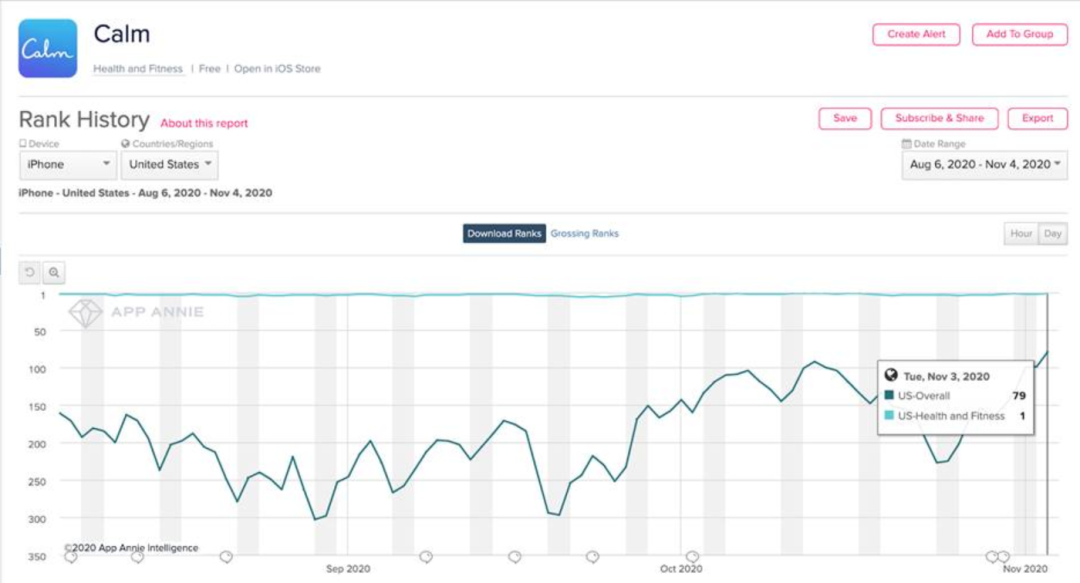 根据第三方分析机构 Sensor Tower 和 App Annie 的数据,Calm 大幅提升了下载量以及在应用商店的排名。