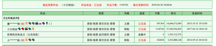 而在墨香铜臭专栏下方的作品栏中,其最近更新的作品为完结的《天官赐福》,最后更新时间为2018年6月20日。除去作品栏里一本未动笔的作品,剩余的三本作品《魔道祖师》《天官赐福》《人渣反派的自救系统》,仅剩下一本《天官赐福》未被锁文。