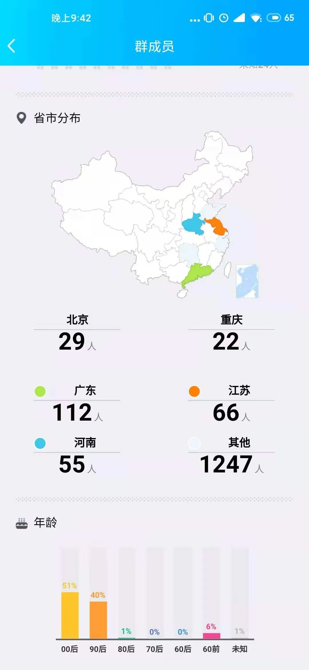 观察蒙淇淇粉丝QQ群的成员构成可以发现,在年龄分布上有51%是00后,40%是90后,绝大多数是女生,分布在广东、江苏、河南等全国各地。