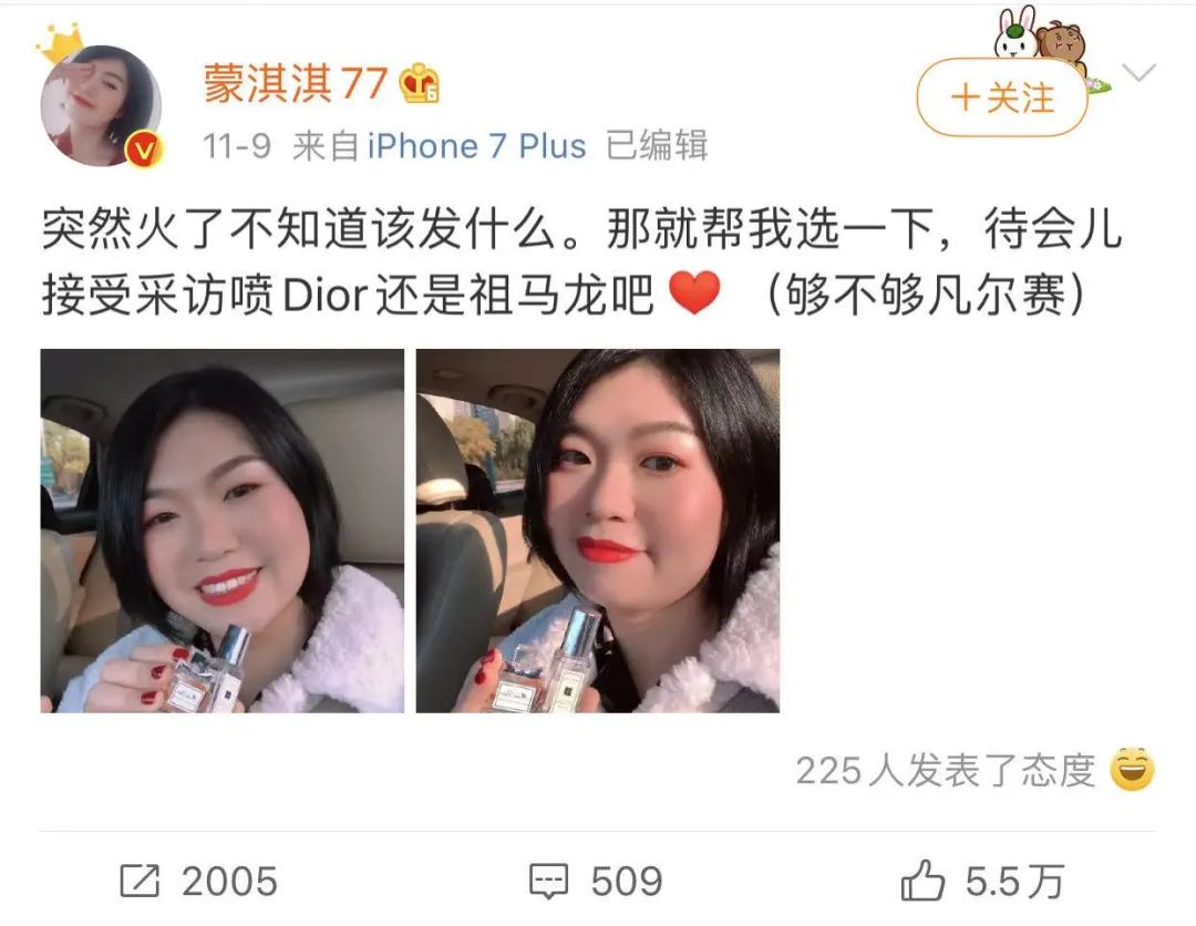 蒙淇淇的微博能火,能有粉丝追随,本质上正与如今市面上甜宠剧盛行的逻辑一致,她树立的贵妇人设其实在为许多小女生“造梦”。