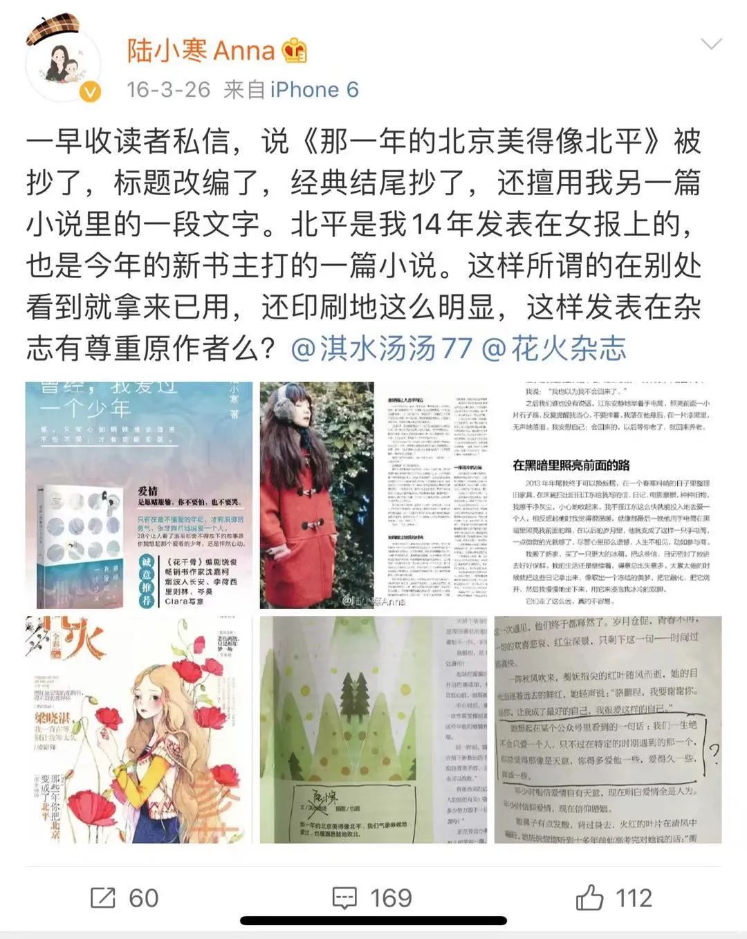 谈到后续处理,陆小寒说,“当时我的出版公司是磨铁,应该有发律师函给她,但后来也不了了之,因为抄袭什么的其实很难维权的。我们也算是弱势群体,大家也都没有办法,所以全靠自己作为一个写作者的职业操守。”