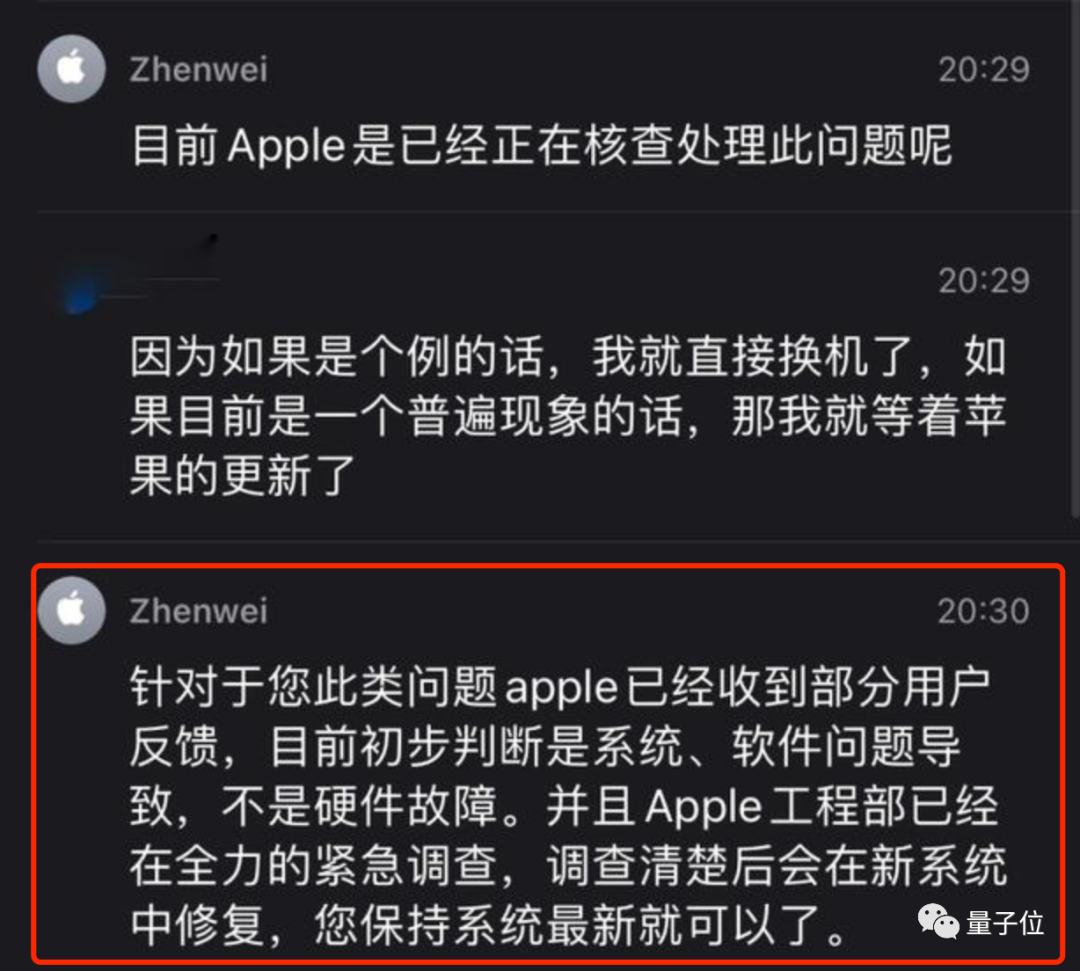 威锋论坛上又网友晒出截图,苹果官方客服初步判断为系统、软件问题导致,不是硬件故障。