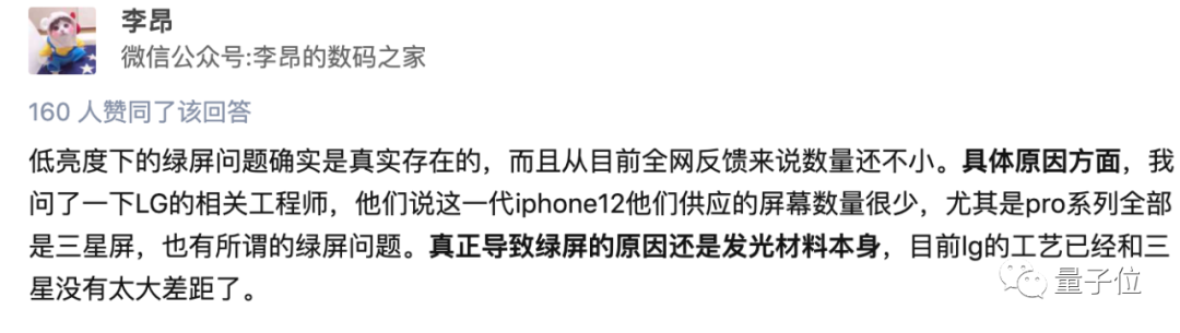 不过知乎网友@李昂表示,这一代iPhone 12 LG供应的屏幕数量很少,尤其是Pro系列全部是三星屏,也有所谓的绿屏问题。