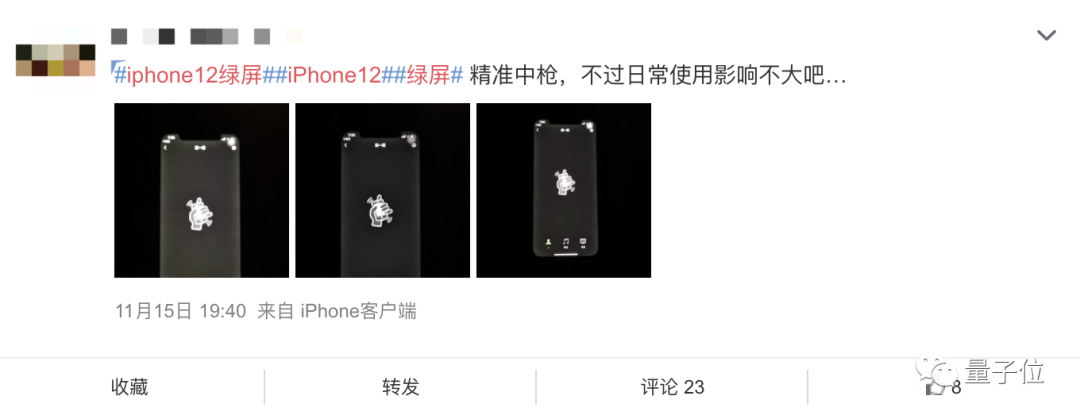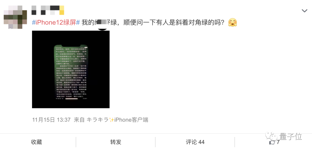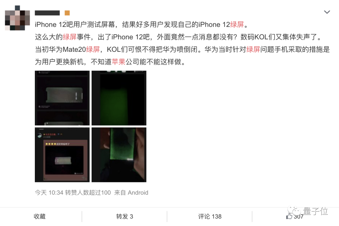 给我发了几张截图,嗷!原来是昨天,有一群年轻人,都在讨论他们iPhone 12的屏幕变「绿」了。