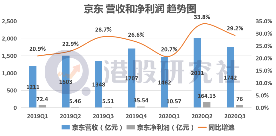 零售业务板块,2020年第三季度营收人民币1632亿元,同比增长26.9%。其中电子产品及家用电器商品收入达到人民币933亿元,同比增长23%;日用百货商品收入人民币为581亿元,同比去年同期增加34.8%。