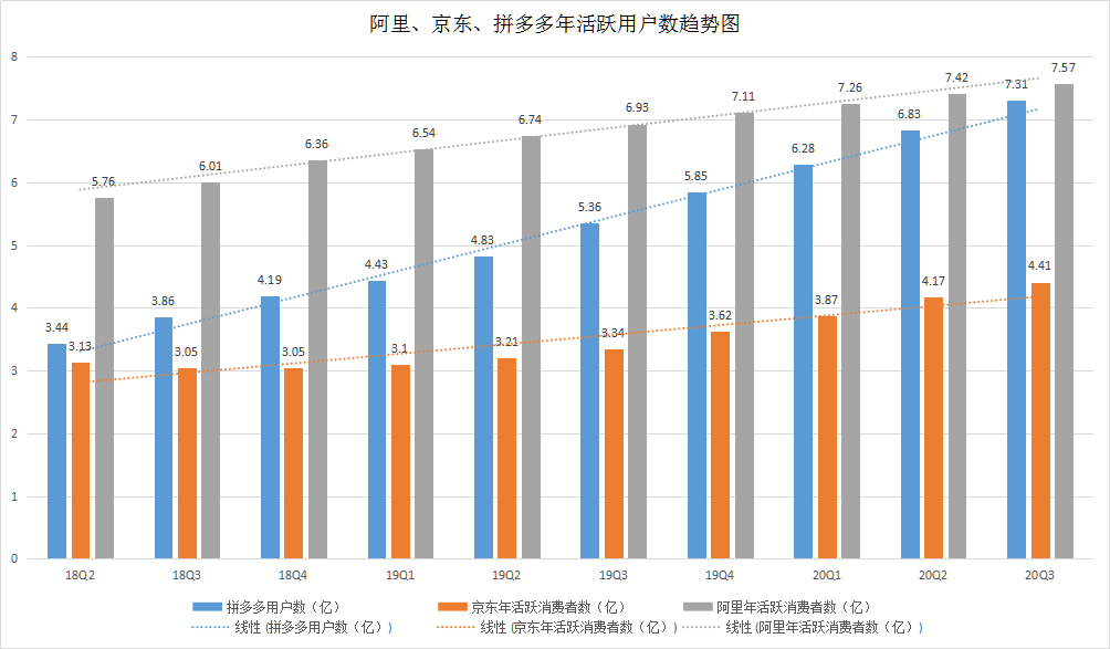 与上个季度对比来看,本季度的新增用户速度出现了放缓,环比下降了5.7%。在下沉市场,面对拼多多这一后起之秀,京东当前的状况无疑是异常艰难的。结合拼多多第三季度的表现,在第三季度其活跃用户数量达到7.313亿人,离阿里巴巴三季度7.57亿的数据仅一步之遥,而京东还远远落后于阿里和拼多多。