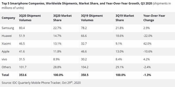 (IDC统计,各品牌手机Q3全球出货量)