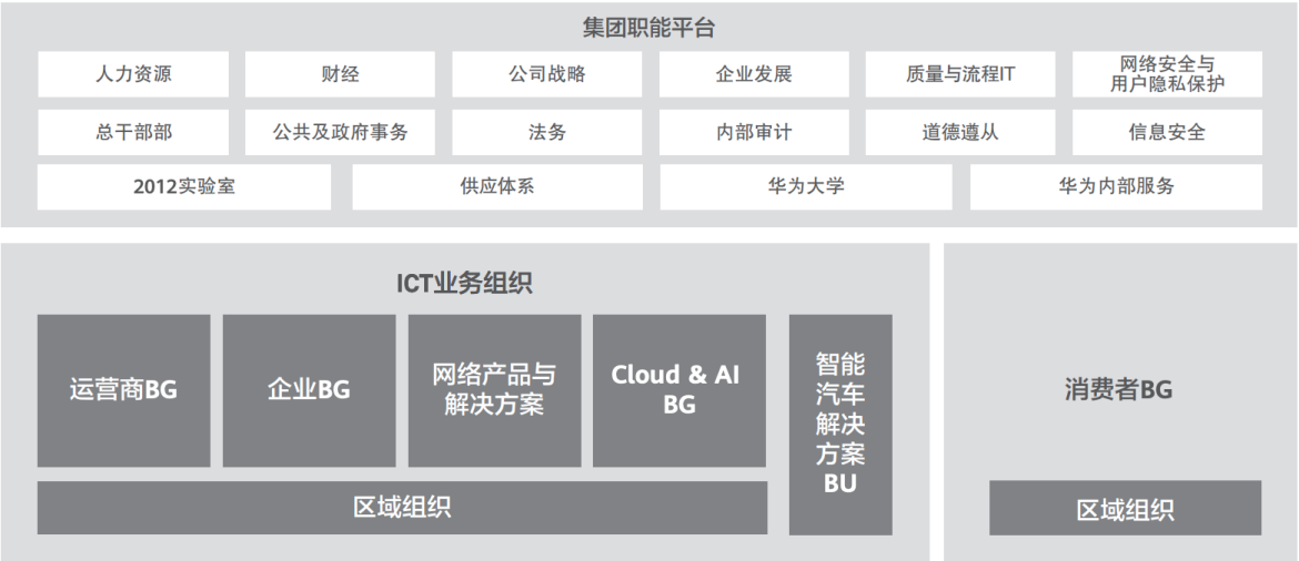 另一方面,在华为的组织架构中,华为复杂的业务被分成两个部门,此前,运营商BG、企业BG、智能汽车BU等业务都被放在ICT(信息与通信技术)下,而手机等硬件产品则放在消费者BG下。