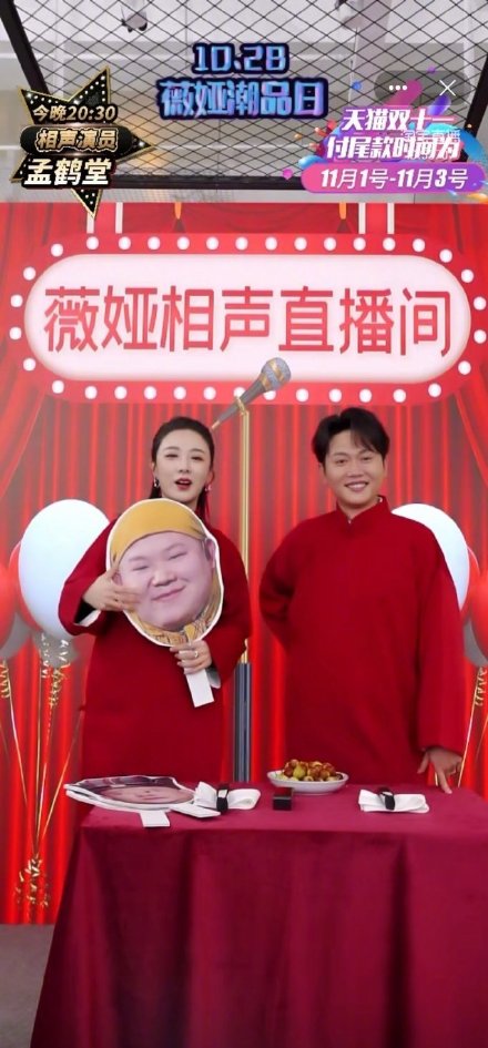 从接外务到自有品牌自销,德云社已经依靠德云女孩们完成了不少商业KPI。不光是品牌带货,德云社今年也乘上了直播带货的东风,让一些弟子加入到了电商直播的阵营。如鹤字科弟子孟鹤堂,在双11期间多次以嘉宾身份进入薇娅直播间,以说相声的形式配合薇娅进行带货。
