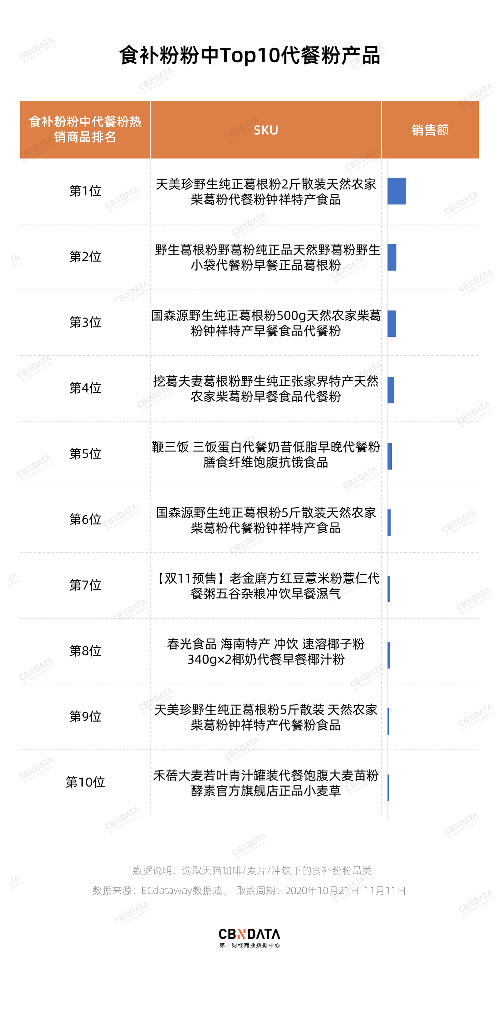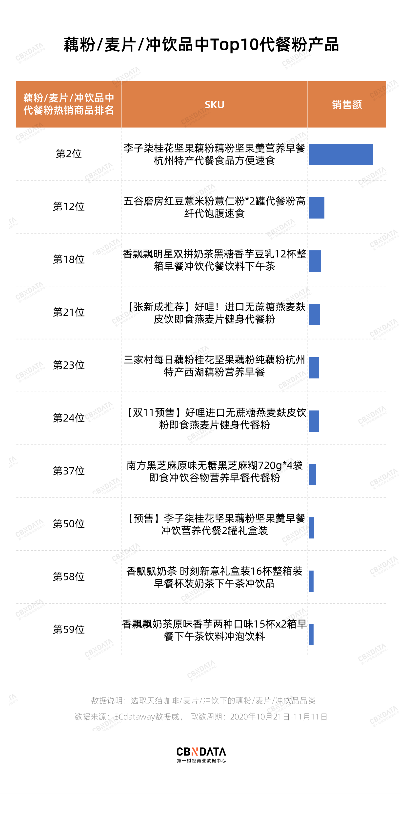 由于代餐粉产品在天猫平台上分布较广,大部分被纳入到了咖啡/麦片/冲饮下的天然粉粉食品这个细分类目中,但咖啡/麦片/冲饮下面的食补粉粉、藕粉/麦片/冲饮品也都有产品会被冠上代餐字样。因此,CBNData消费站分别整理了天然粉粉食品、食补粉粉以及藕粉/麦片/冲饮品中的代餐粉类产品的销售排名。