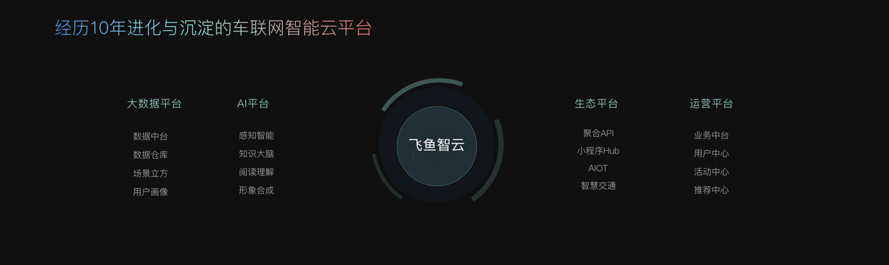 飞鱼智云1.0是飞鱼智云核心平台和服务进行产品化和商业化的产物。其主要包含了大数据、AI和业务中台,以及智能化云应用,如场景立方、汽车知识大脑、用户画像等。