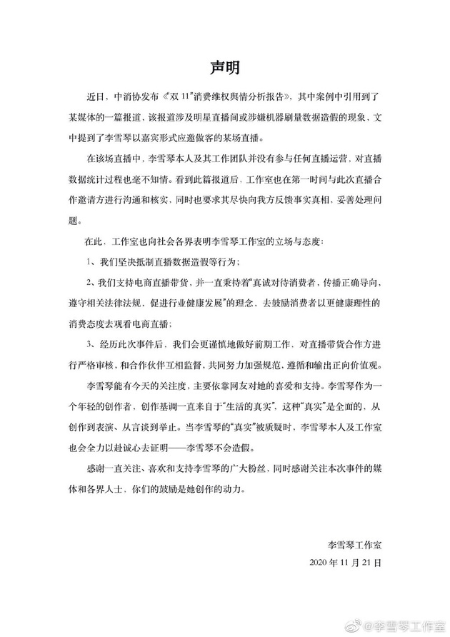 李雪琴工作室声明则表示,在相关直播中,其本人及其工作团队并没有参与任何直播运营,对直播数据统计过程也毫不知情。看到相关报道后,已第一时间与直播合作邀请方进行沟通和核实,同时要求其尽快反馈事实真相、妥善处理问题。