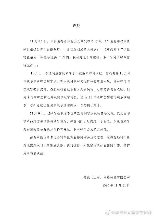 李佳琦直播官方微博发布声明称,消费者曾在11月6日将问题反映给品牌方和李佳琦直播间,厂商因为当时货品已售完无法换货,进行了退款,直播间一直与品牌方积极协调做好售后。如果顾客对目前的售后解决方案仍有意见,将负责到底。