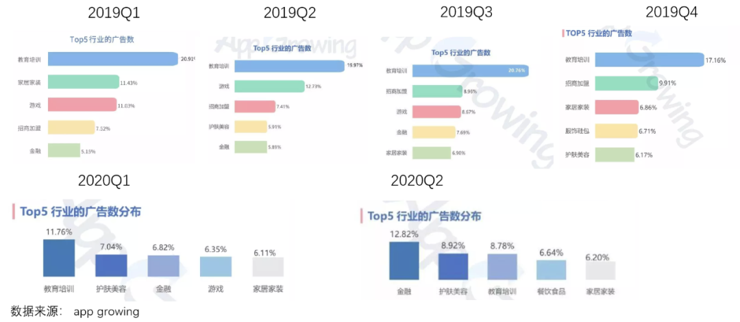 TOP5行业已经连续6个季度没有医疗广告;金融行业广告占比在TOP5的排行一直在降低,2019Q4从TOP5排行中退出(2020Q1、Q2金融行业广告再次占比较重,推测是受蚂蚁集团、京东金融、陆金所等金融科技企业寻求上市,大规模投放的影响)。