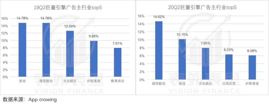 字节跳动旗下的巨量引擎广告相比2019Q2,2020Q2头部广告客户有大的调整,应用推广、电商推广的占比增加。