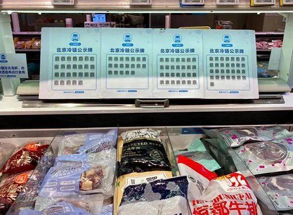 请北京盒马牛肉冷柜上方放置有北京冷链二维码。(图片拍摄:赵晓娟)