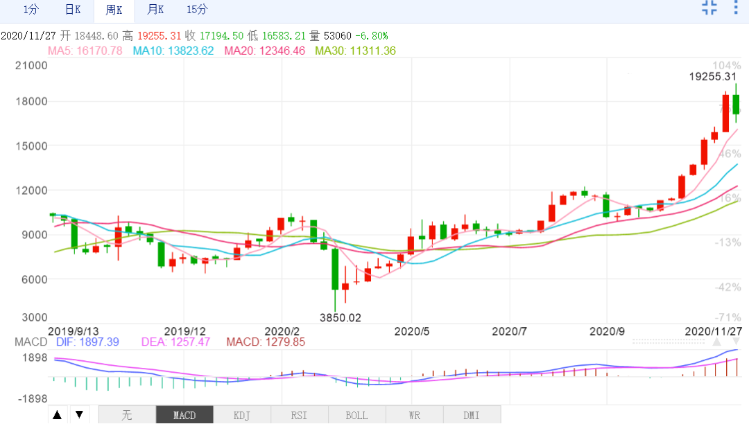 2020年11月25日,比特币兑美元价格站上19000美元大关,距离2017年12月17日创下的19875美元历史高点仅一步之遥,随后行情连续两日走低,甚至一度暴跌3000美元。