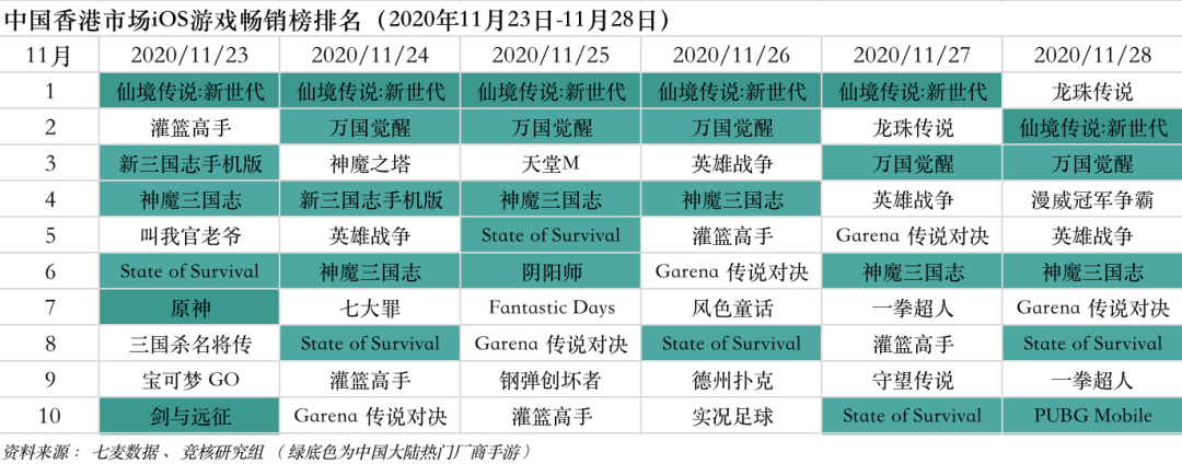 11月23日,阿里游戏所代理的日本光荣特库摩公司授权的《新三国志手机版》多次闯进香港IOS游戏畅销榜Top5。早在2017年11月,阿里就正式在台港澳地区发行该作。从版本更新内容来看,七麦数据显示该作自进入11月份更新较为频繁,在此之前的更新记录为2020年7月。