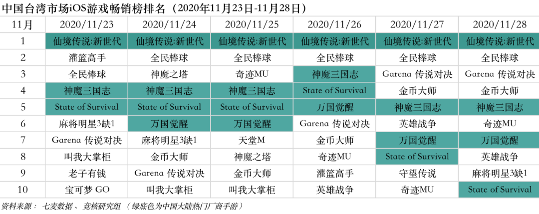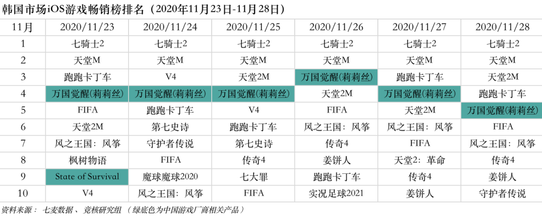 2020年2020年11月23日—11月28日韩国IOS游戏类畅销榜中,仅莉莉丝、FunPlus两家中国厂商旗下游戏上榜。