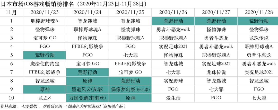 日本2020年2020年11月23日—11月28日IOS游戏类畅销榜中,网易、莉莉丝、米哈游、乐元素、米哈游、友塔等厂商产品进入Top10行列。