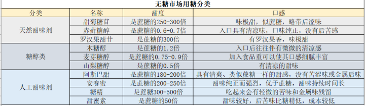 所谓无糖食品,是指固体或液体食品中每100克或100毫升的含糖量不高于0.5克。食品公司通常使用甜味剂(也就是代糖)来替换产品中的蔗糖,为此需要平衡不同代糖在甜度、口感、成本以及对人体影响等维度上的表现。大多数代糖比糖甜很多倍,这些代糖需要较少量就能提供相同水平的甜味。一些代糖的热量较低,有一些甚至可以忽略不计,代糖在无糖食品中是不可或缺的重要原料。
