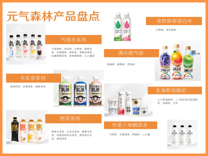 目前,元气森林家族除了气泡水外,还有燃茶、能量饮料、乳茶、酸奶、气泡果汁等产品线,口味多达几十种,产品主打无糖健康的口号,该品牌正在努力跳出单一爆款的消费场景,朝多品类的方向发展。