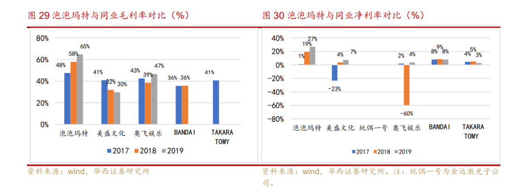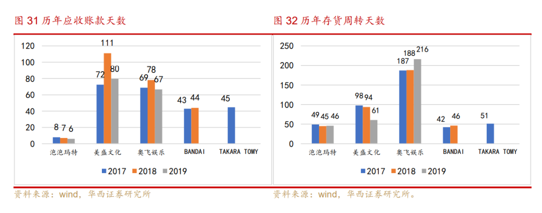 2017~2019年,泡泡玛特的存货周转天数分别为49、46、46(天)。对比同行,泡泡玛特高于BANDAI,但低于奥飞娱乐、美盛文化和TAKARA。也体现出公司定期监察存货水平,合理预测销量、把控库存的能力。