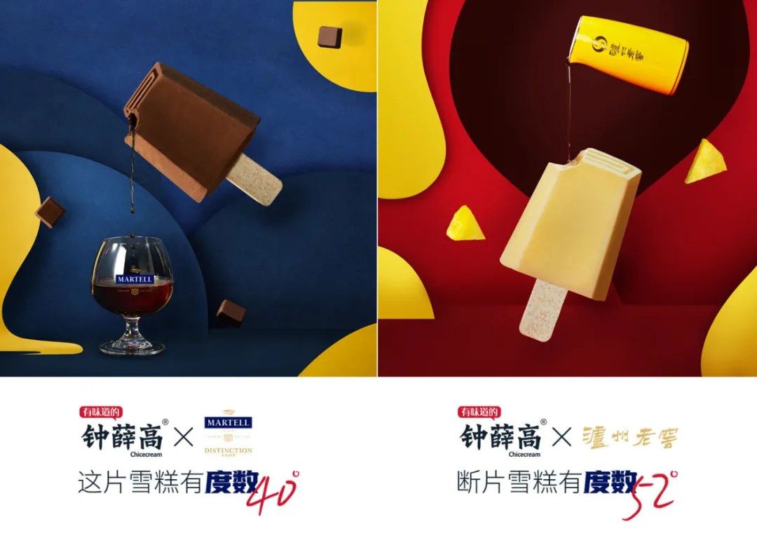 以钟薛高为例,其在推出丝绒可可、特牛乳等招牌口味雪糕的同时,也以联名的形式让产品涉足更多领域。去年,钟薛高联合泸州老窖推出了“断片”雪糕。今年,钟薛高又与老朋友泸州老窖及新伙伴马爹利合作,做出了“断片有度数”的联名活动。