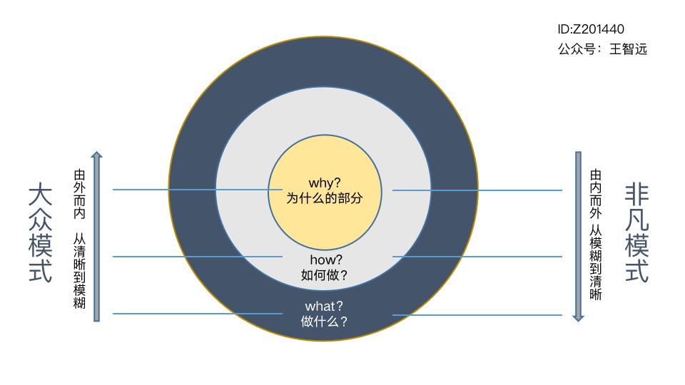 这就是大众模式与非凡模式沟通本质不同的地方,也是多数高级管理者学习的黄金圈沟通法则,那么具体是什么呢?