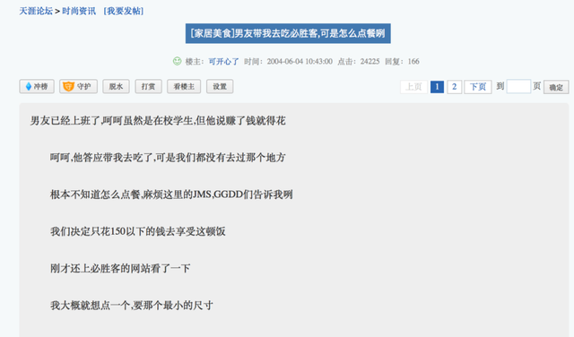 在天涯的家居美食版块,一个ID名为「可开心了」的楼主发布了一条帖子,标题是:「男友带我去吃必胜客,可是怎么点餐嘞。」她还在帖子中强调,「我们准备只花150以下的钱去享受这顿饭。」