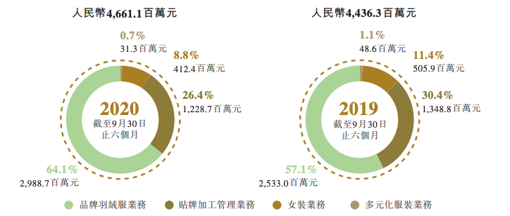 财报显示,波司登2020年上半财年品牌羽绒服业务录得收入29.89亿元,同比增长18%,占总营收的比例达64.1%,相比去年同期的57.1%明显上涨;多元化服装业务收入占比则进一步收缩,从1.1%降至0.7%。