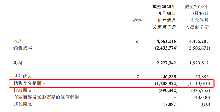 2020年上半财年,波司登的销售及分销开支从去年同期的11.19亿元上升至12.09亿元,同比增长8%,占总营收的比例达26%。