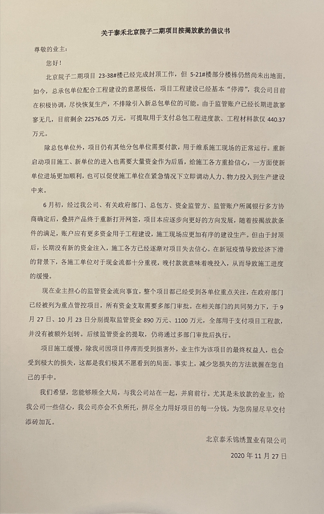 然而,泰禾并没有理会业主这封公开信。11月27日,北京院子二期业主收到泰禾的“催款函”,内容显示,泰禾承认项目工程建设“停滞”,但将其归因为业主没有按时“放款”。