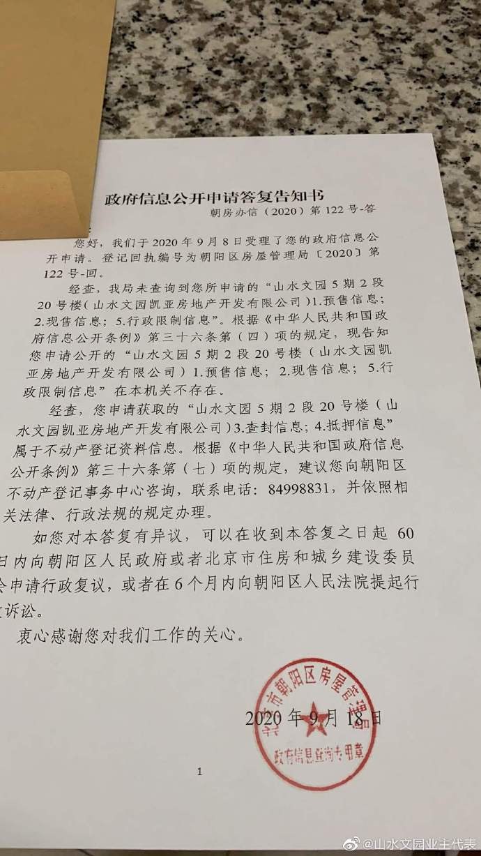 北京东三环的山水文园·九御,毛坯房建好,却迟迟没有交楼。根据媒体报道,项目于2016年即竣工,开发商捂盘惜售,直至2019年才申请了一栋楼的预售证。微博账户“@山水文园业主代表”在网上公开他收到的朝阳区房管局信息公开申请答复,他所购房子所在的山水文园5期2段20号楼均无任何预售、现售信息。