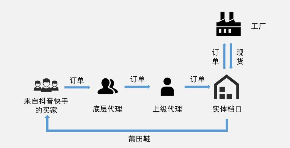 目前为止,莆田鞋已经有完整且成熟的产业链,可以将其分为上下游,上游是莆田鞋工厂,一般只给批发市场档口供货,很少直接与销售代理接触。下游是销售发货,一般分为上线和底层代理,上级代理主要发展下线,而底线代理通过各种渠道卖货。