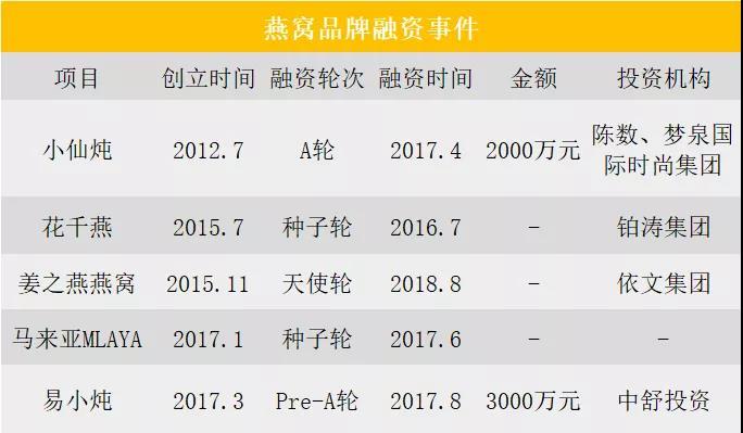 成立于2014年,号称“鲜食燕窝”开创者的小仙炖,就在2015-2017年期间先后取得了三轮共计超过2000万元的投资。投资阵营中有洪泰基金、360创始人周鸿祎,还有演艺明星陈数和章子怡。