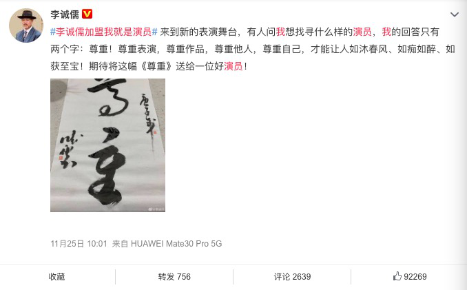 “有人问我想找寻什么样的演员,我的回答只有两个字:尊重!”,同时还奉上了全新的“三如箴言”:如沐春风、如痴如醉、如获至宝。李诚儒本人应该是深谙市场舆论发酵的,当然也可能是耿直使然,他在官宣的过程中提出了意味深长的两个字:尊重,而这也是他和郭敬明在《演员请就位2》中battle的重点。