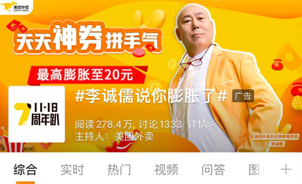 再次,走红的老艺术家同样解锁了自己的商务资源。拿下美团外卖天天神券推荐官,三如箴言再次营业外,#李诚儒说你膨胀了#的话题阅读量破亿;而基于其在节目点评中擅长四字词语的习惯,他还顺利和网易有道词典合作推出了“声音”短片;除此之外,他还登上了京东双十一晚会,凭借着“爱心发型”撬动多个热搜。