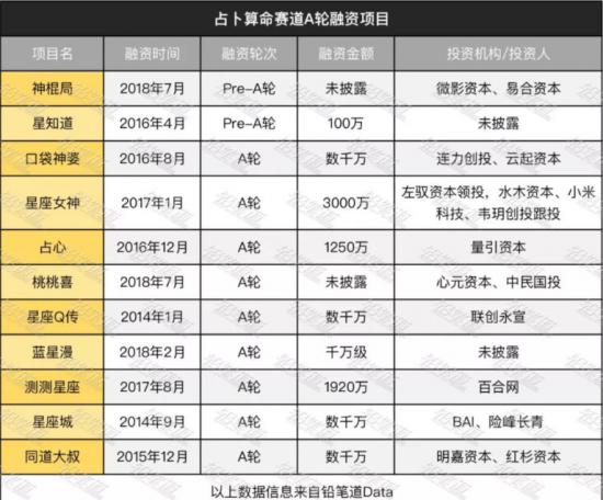 据铅笔道不完全统计,占卜算命赛道中已经融资的项目共计20个,其中完成A轮融资的项目为9个,Pre-A轮2个,天使轮5个,种子轮4个。对外披露的数据中,获得千万融资以上的项目有9个。
