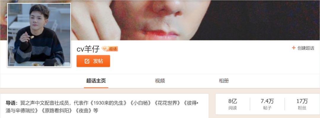 如今微博动漫类超话排行榜上,位居第一的既不是热播动漫作品《天官赐福》《咒术回战》,也不是大众知名度最高的配音演员,而是在多部广播剧中担任主役的CV“羊仔”。另一位超话高位CV“倒霉死勒”,代表配音角色是著名耽美IP《撒野》广播剧中的顾飞。