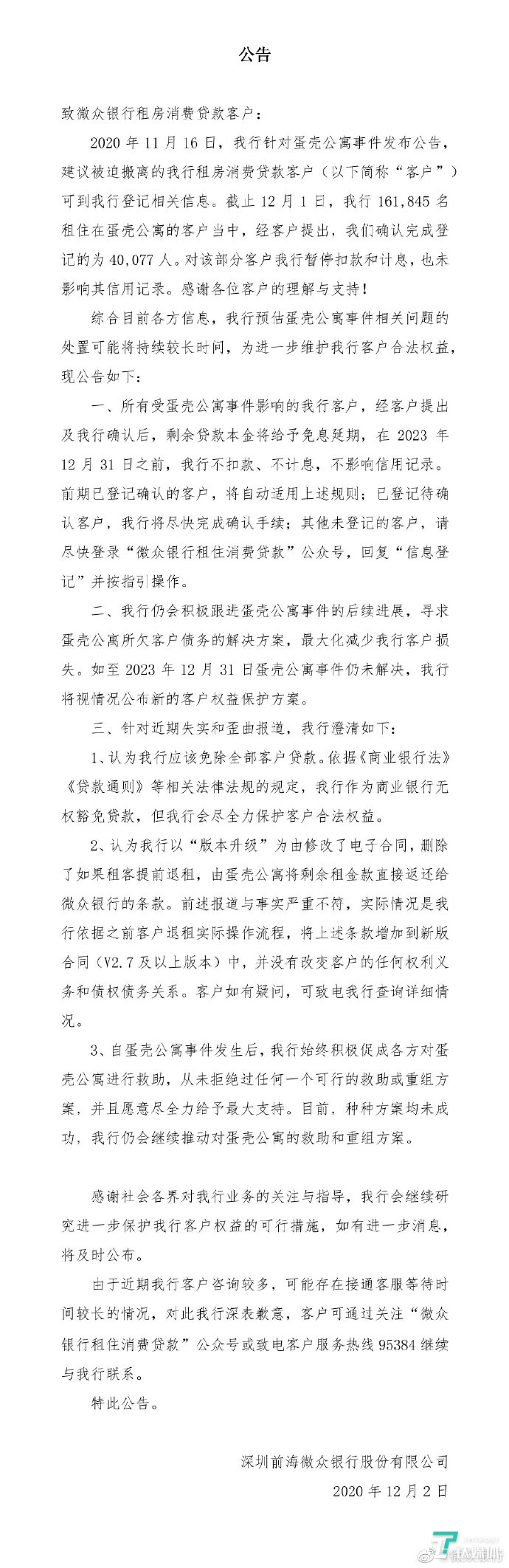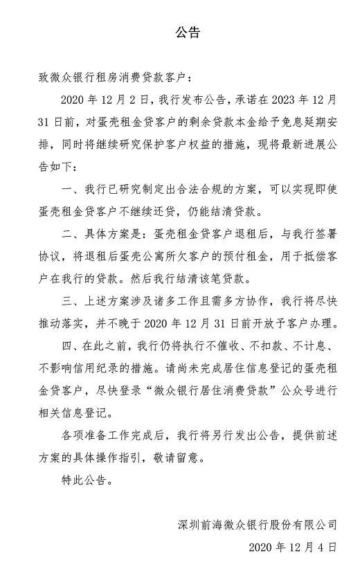 12月4日下午,微众银行再次针对蛋壳公寓租金贷客户发布公告,称已经研究制定出合法合规的方案,可以实现即使蛋壳租金贷客户不继续还贷,仍能结清贷款。